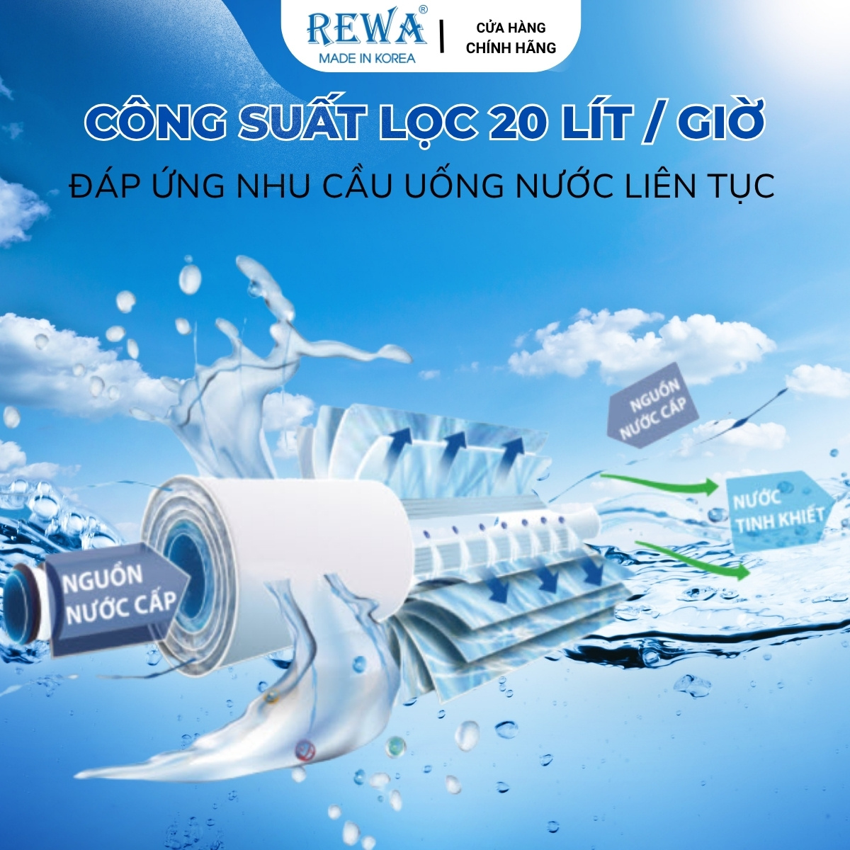 - Máy lọc nước REWA được trang bị màng lọc công nghệ tiên tiến từ Hàn Quốc, cho khả năng lọc liên tục 20 lít nước tinh khiết mỗi giờ, đáp ứng đầy đủ nhu cầu uống nước cho cả gia đình và văn phòng.