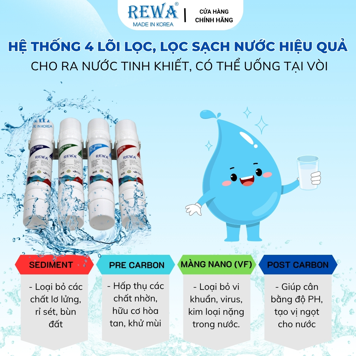 Với quy trình lọc hiện đại Sediment – Pre Carbon – Màng VF – Post Carbon, máy lọc nước REWA mang đến: