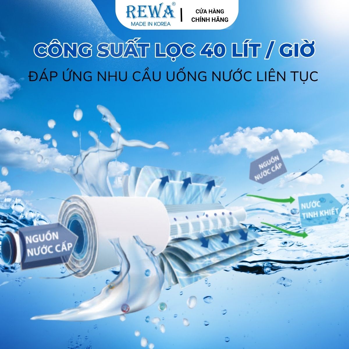 - Máy lọc nước REWA được trang bị màng lọc công nghệ tiên tiến từ Hàn Quốc, cho khả năng lọc liên tục 40 lít nước tinh khiết mỗi giờ, đáp ứng đầy đủ nhu cầu uống nước cho cả gia đình và văn phòng.