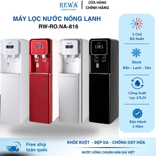 - Trong thời đại mà sức khỏe và tiện nghi là hai yếu tố được đặt lên hàng đầu, Máy lọc nước nóng lạnh RW-RO.NA-816 thương hiệu REWA – MADE IN KOREA ra đời như một giải pháp toàn diện, đáp ứng đồng thời 3 nhu cầu: Nước sạch, nước tốt và nước tiện ích. Không chỉ cung cấp nước ion kiềm giàu hydrogen tốt cho sức khỏe, thiết bị còn tích hợp chức năng làm nóng – làm lạnh tiện lợi, đáp ứng mọi nhu cầu sử dụng nước của gia đình bạn.