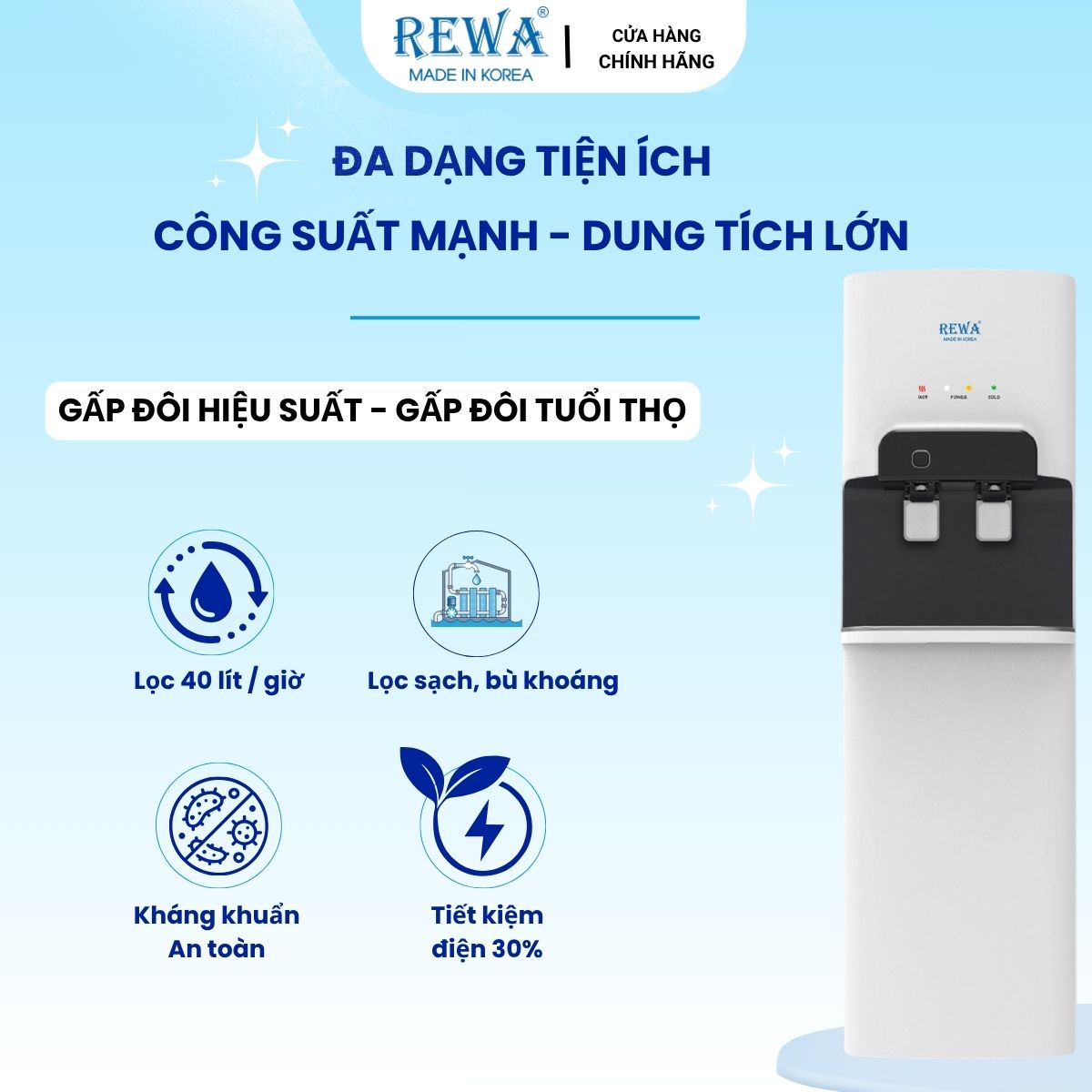 👉 Với công nghệ Hàn Quốc hiện đại, REWA mang đến sự tiện ích toàn diện, chăm sóc sức khỏe và cuộc sống của cả gia đình chỉ trong một chiếc máy lọc nước.