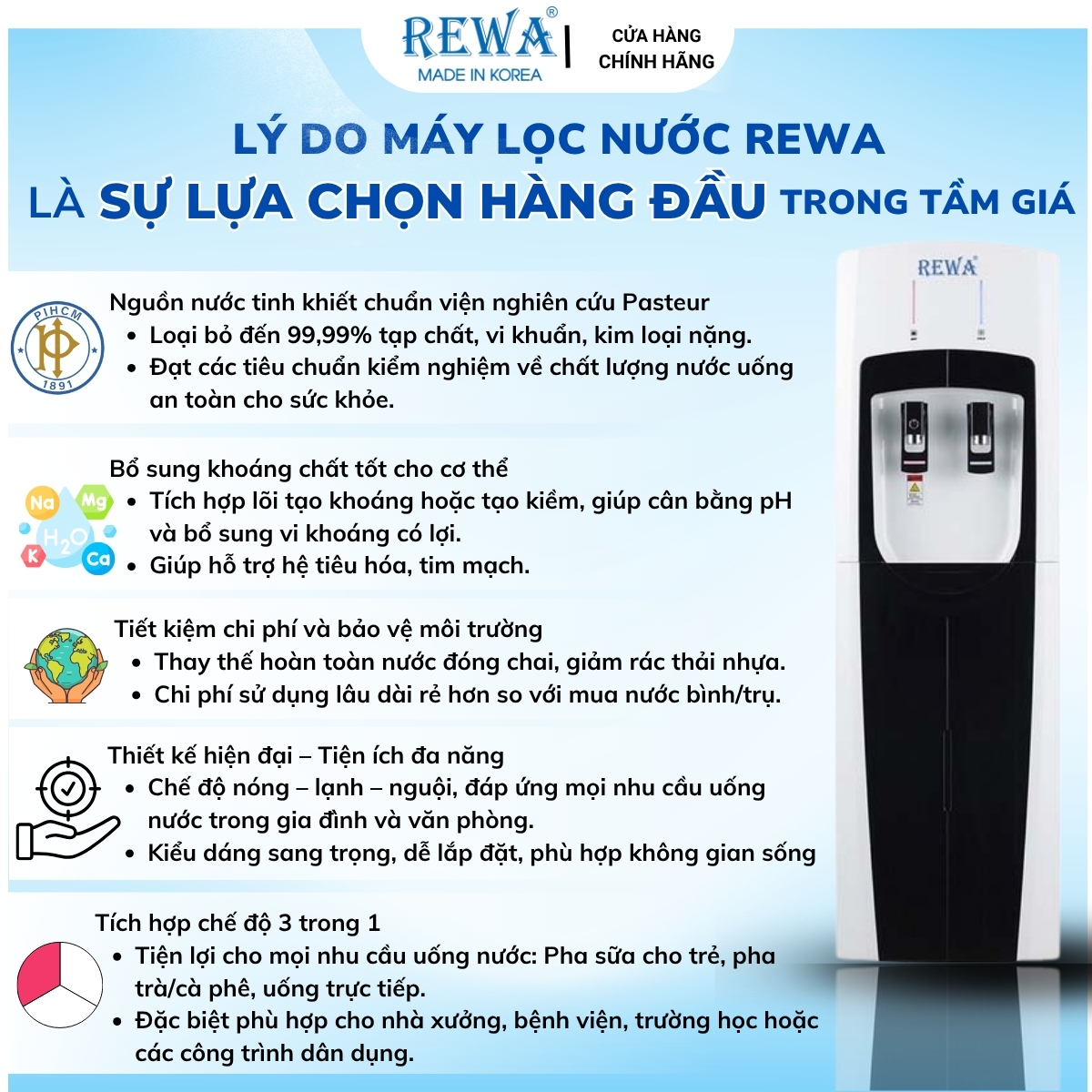 👉 Với công nghệ Hàn Quốc hiện đại, REWA mang đến sự tiện ích toàn diện, chăm sóc sức khỏe và cuộc sống của cả gia đình chỉ trong một chiếc máy lọc nước.