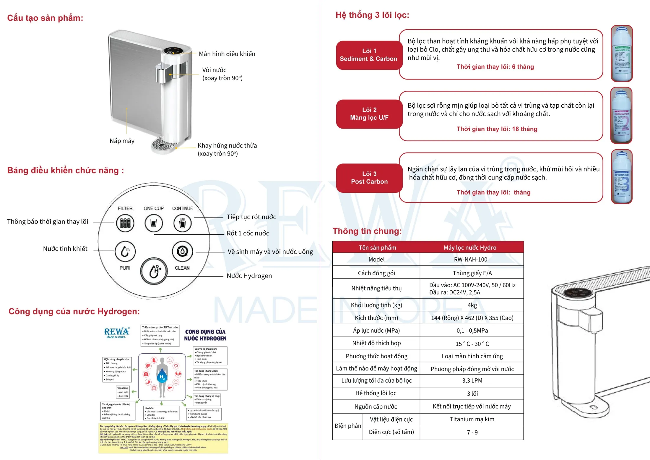 - Máy lọc và tạo nước hydrogen REWA RW-NAH-100 có thiết kế thông minh và dễ sử dụng, phù hợp với gia đình và văn phòng. Máy có bảng điều khiển đơn giản, giúp người sử dụng dễ dàng lựa chọn chế độ lọc và tạo nước hydrogen một cách nhanh chóng.