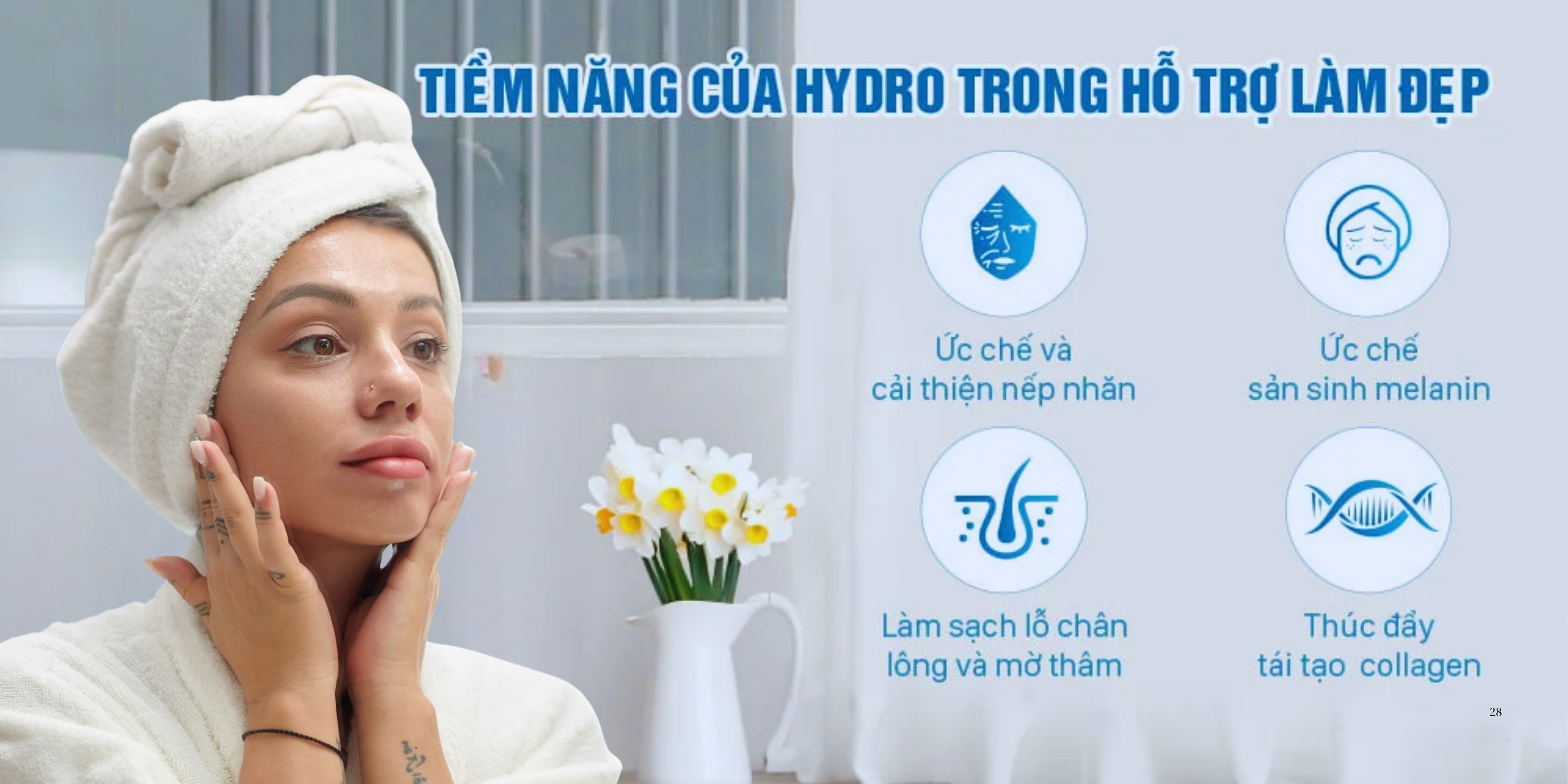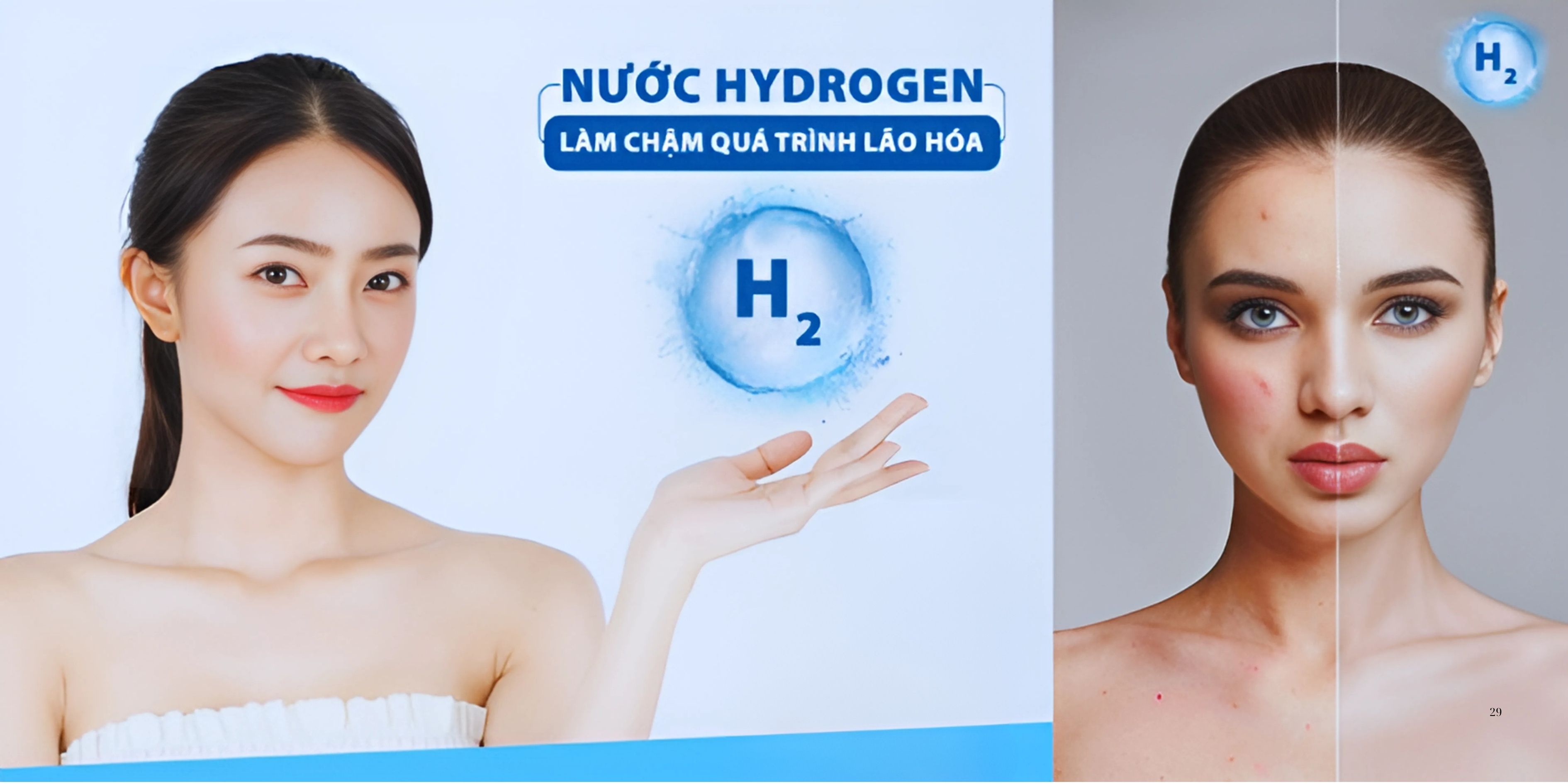 - Nước hydrogen không chỉ tốt cho sức khỏe mà còn mang lại tiềm năng làm đẹp vượt trội. Với khả năng ức chế quá trình hình thành nếp nhăn, hạn chế sản sinh melanin gây sạm nám, nước hydrogen giúp da sáng mịn và đều màu hơn. Đồng thời, nó hỗ trợ làm sạch sâu lỗ chân lông, mờ thâm, và thúc đẩy quá trình tái tạo collagen tự nhiên, mang lại làn da săn chắc, tươi trẻ và tràn đầy sức sống.